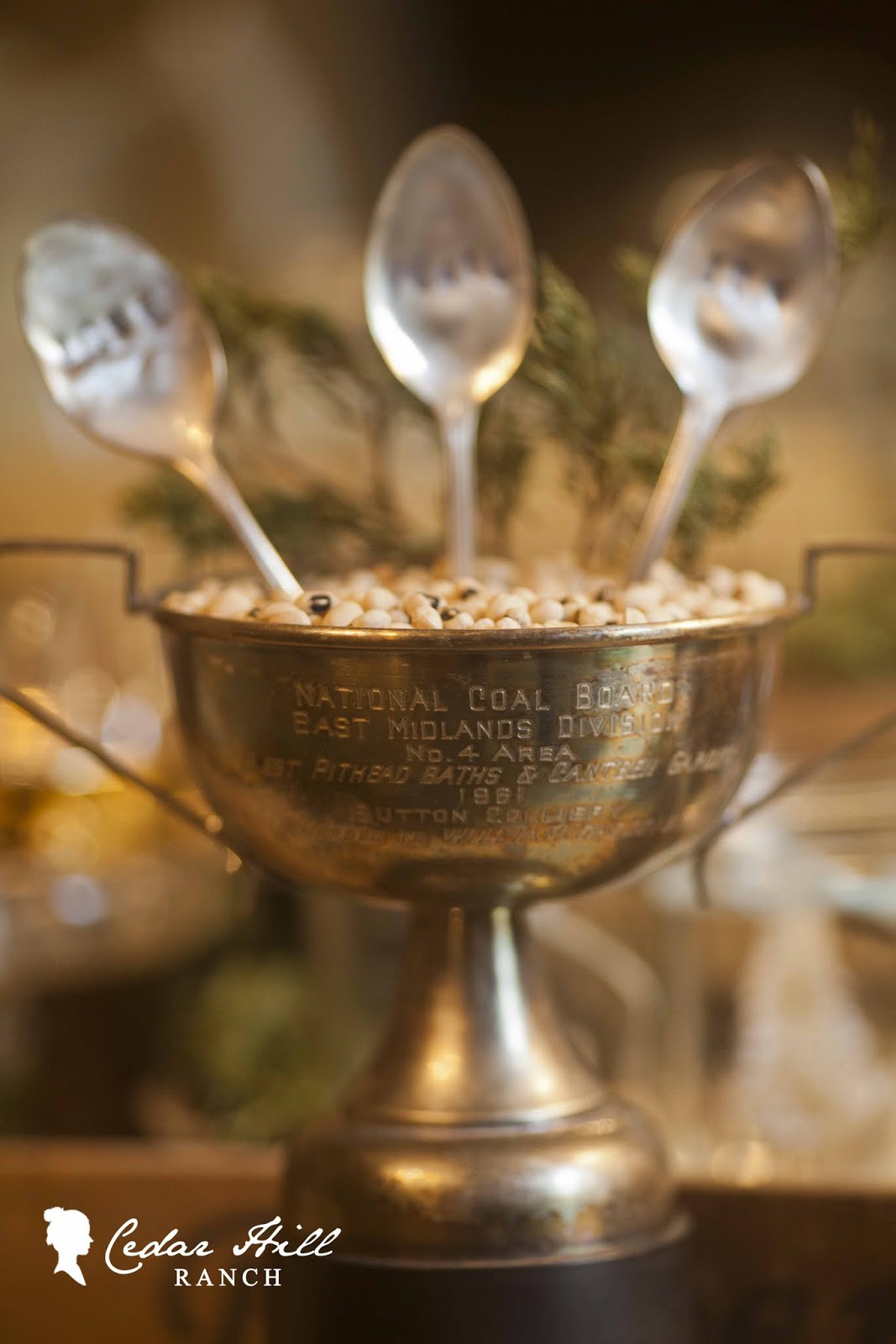 The old trophies are the perfect container for your beautiful spoons, and the black eye peas are very clever and look great! Your collie is beautiful and looks so regal and proud! Lovely post!