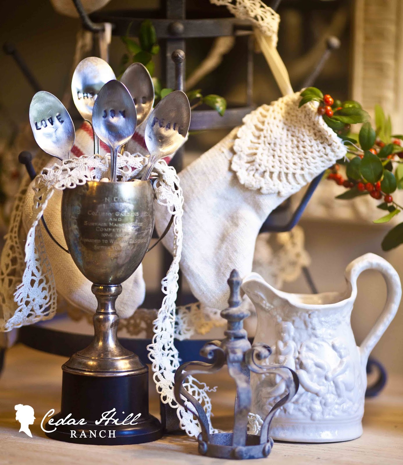 I love your vintage silver all stamped for Christmas! It’s a great idea and I like the use of the beans to hold up the spoons. Beautiful vignette! Merry Christmas!