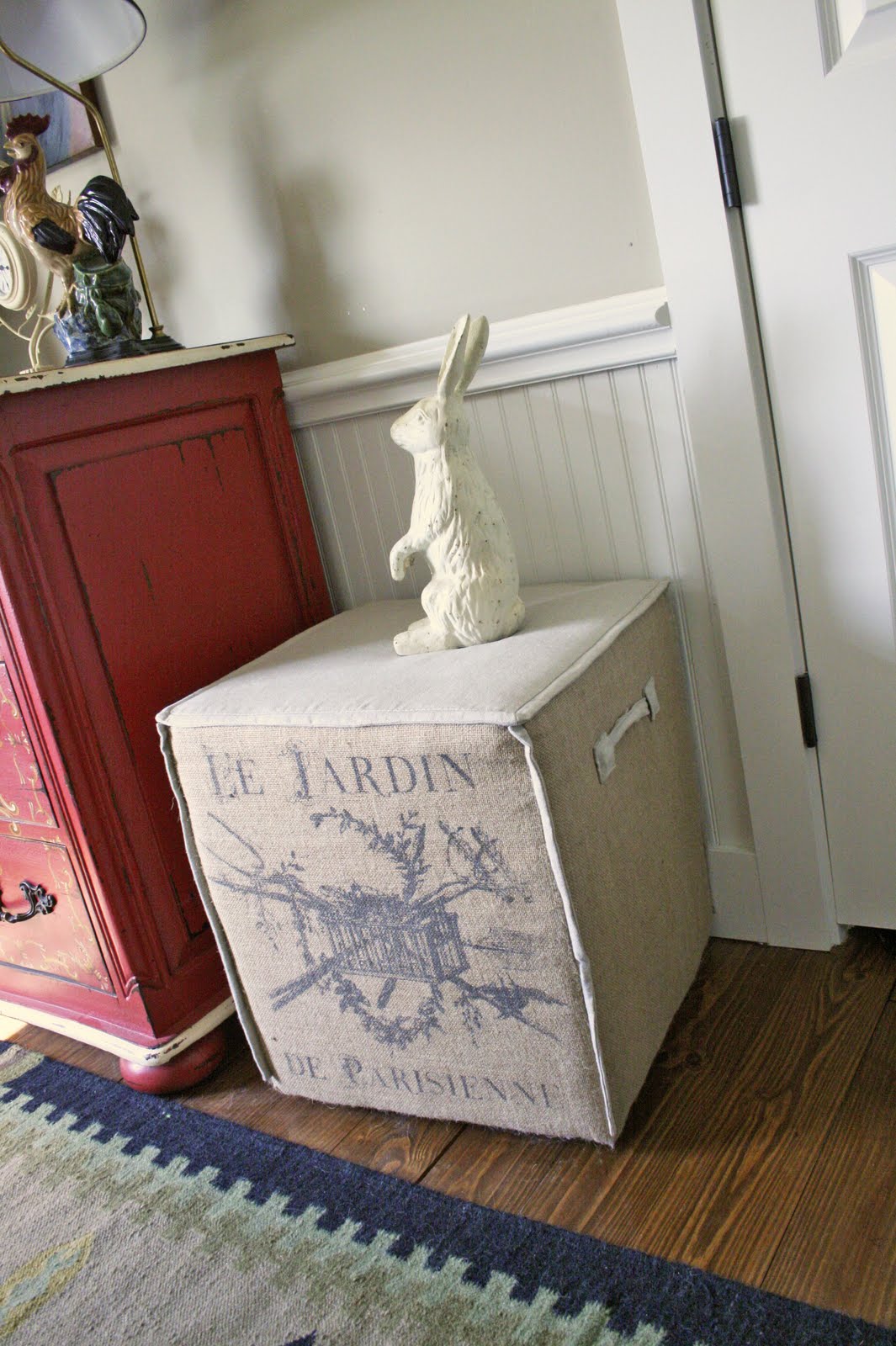 I found three inexpensive small ottomen at TJ Maxx. Is that the plural of ‘ottoman‘? My spell check says, “NO,” apparently it is ‘ottomans‘, which just doesn’t sound right. They were perfect in size, but I really didn’t like the fabric. It was too orangey brown. I made some simple slipcovers for each one. This may look complicated but it was very easy. I simply measured the sides and top of the ottoman and cut a piece of fabric for each side and the top. Using piping string from the fabric store, I made some burlap piping and sewed it around the top piece of fabric. I then sewed the four sides together, making sure that it would fit the top exactly. Next, I sewed the sides to the top. After heming the slipcovers, I was done.