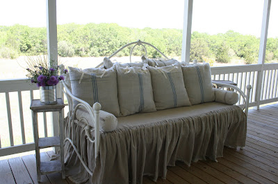 I had two authentic, vintage feed sacks sitting around my house that I had purchased at The Round Top Antique Show, Reflections on Round Top. I purchased one more, some ribbon, and linen fabric for the daybed. Feed sack pillows typically run around $70-$100 a piece and these cost me about $20 each plus my labor. Check back later and I will show how I made them. The daybed cover was also a huge savings since comparable covers cost around $300, and my fabric was less than $100.