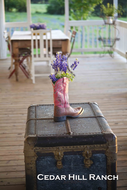 I love the boots-as-flower-holders! And the twine on the reproduction pie safe was a PERfect (and useful) addition.