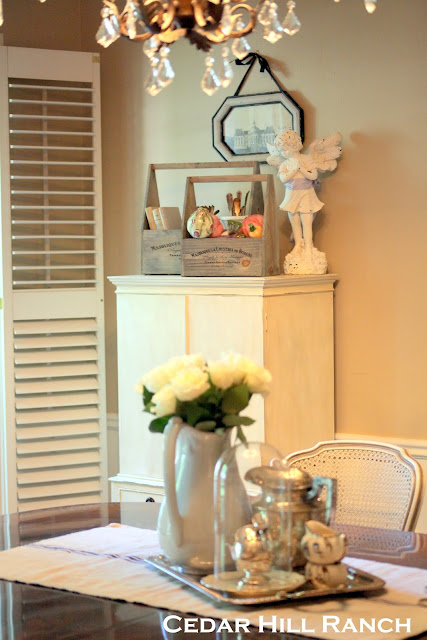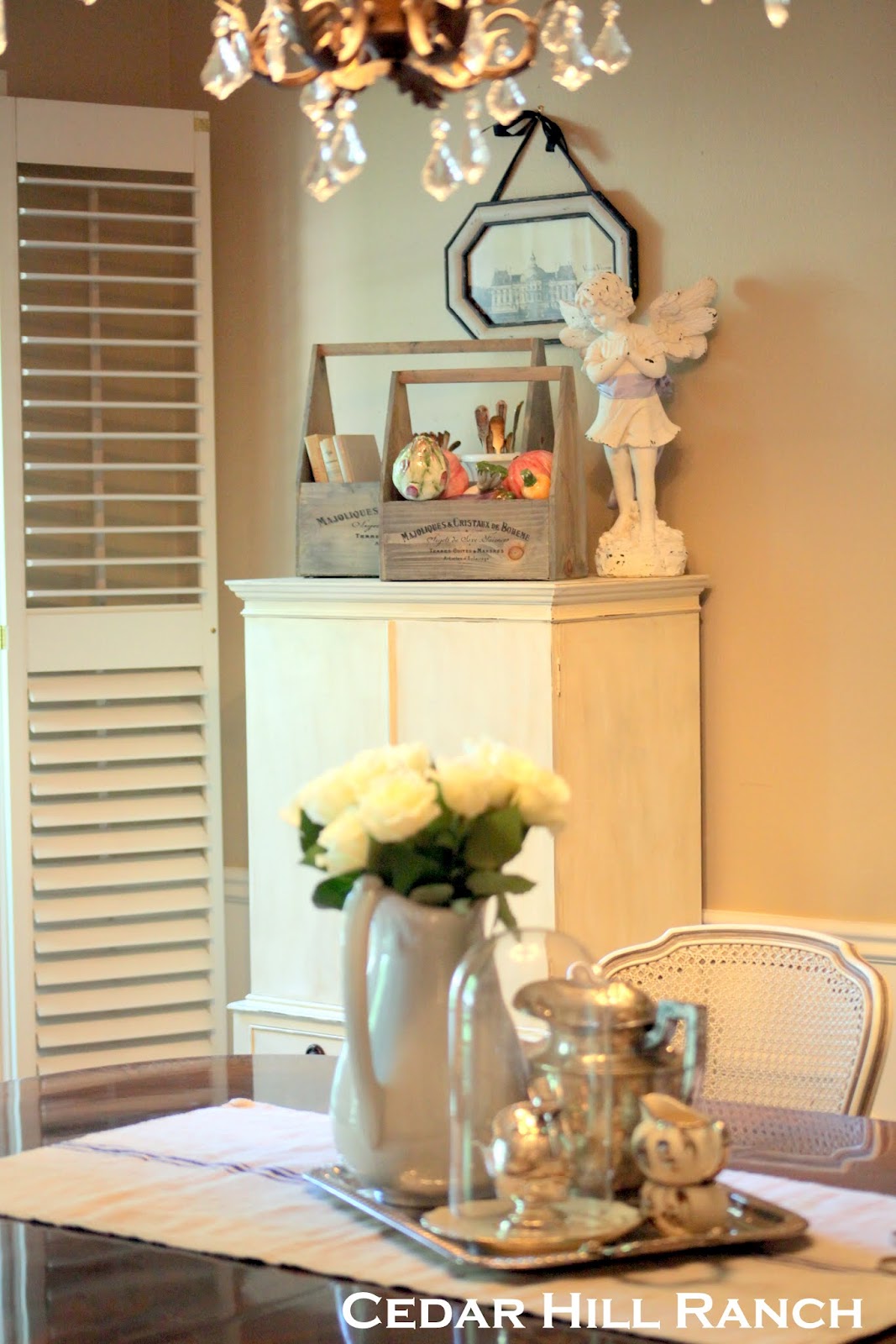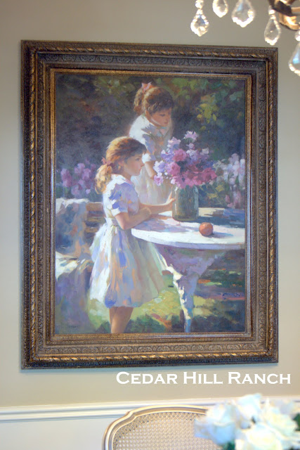 Love shopping the house for new home decor pieces! The “upstairs” cabinet looks fabulous in the dining room. Adore the vignette with the angel! I agree, the painting looks like a mother and daughter …on Cedar Hill Ranch!