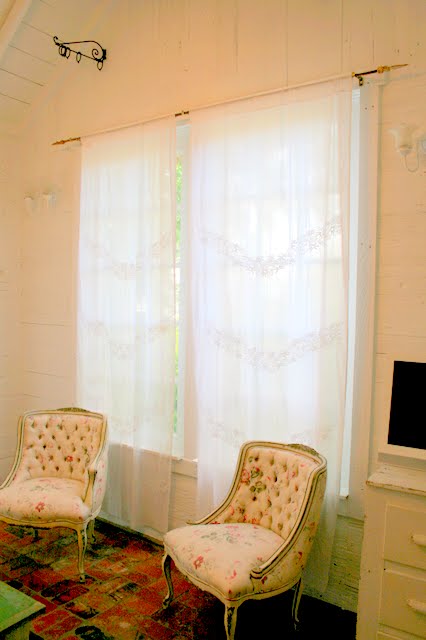 The curtains are soft and feminine eyelet or lace.