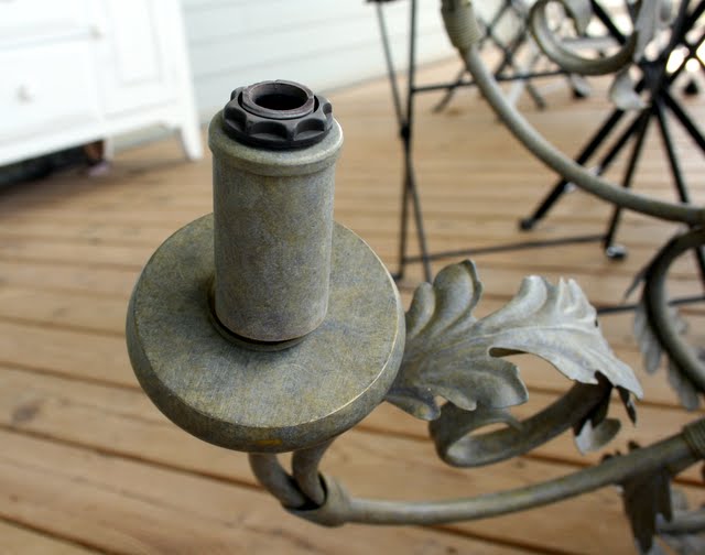 That looks so pretty on your porch and I just LOVE the color you chose. I had a similar problem with a candelabra I converted from electric to candles, those little metal screw things were poking up. I found you can buy shorter ones and they hold the inner workings together and don’t stick up and get in the way of the candle. I bought them at Lowe’s in the lighting section. But your solution is ingenious!