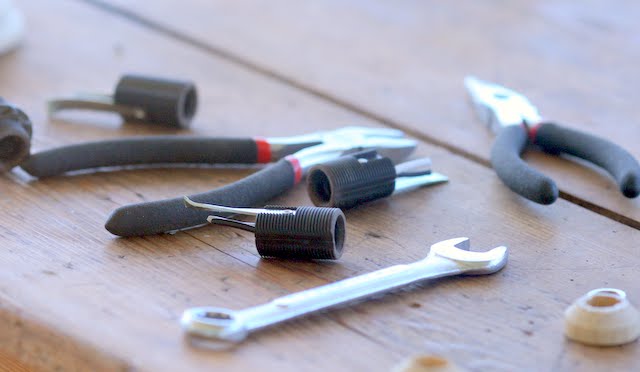 I spent lots of time planning how and where the chandelier would hang, and how I would convert it, but the contractor still wasn’t finished with the deck, and so I waited patiently as the chandy sat silently on my front porch, taunting me every time I walked by it. I had plenty time to plan out how the chandy would be attached and how we could lower it to change out the candles and light them. I designed in my head a rope and pulley system for lowering the chandy when we lit the candles, because the roof is pretty high and there’s no ladder down by the creek. I bought rope, pulleys, and a few rope cleats to use.