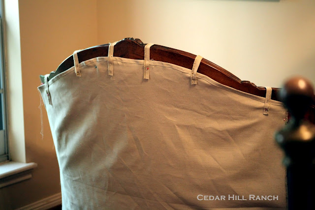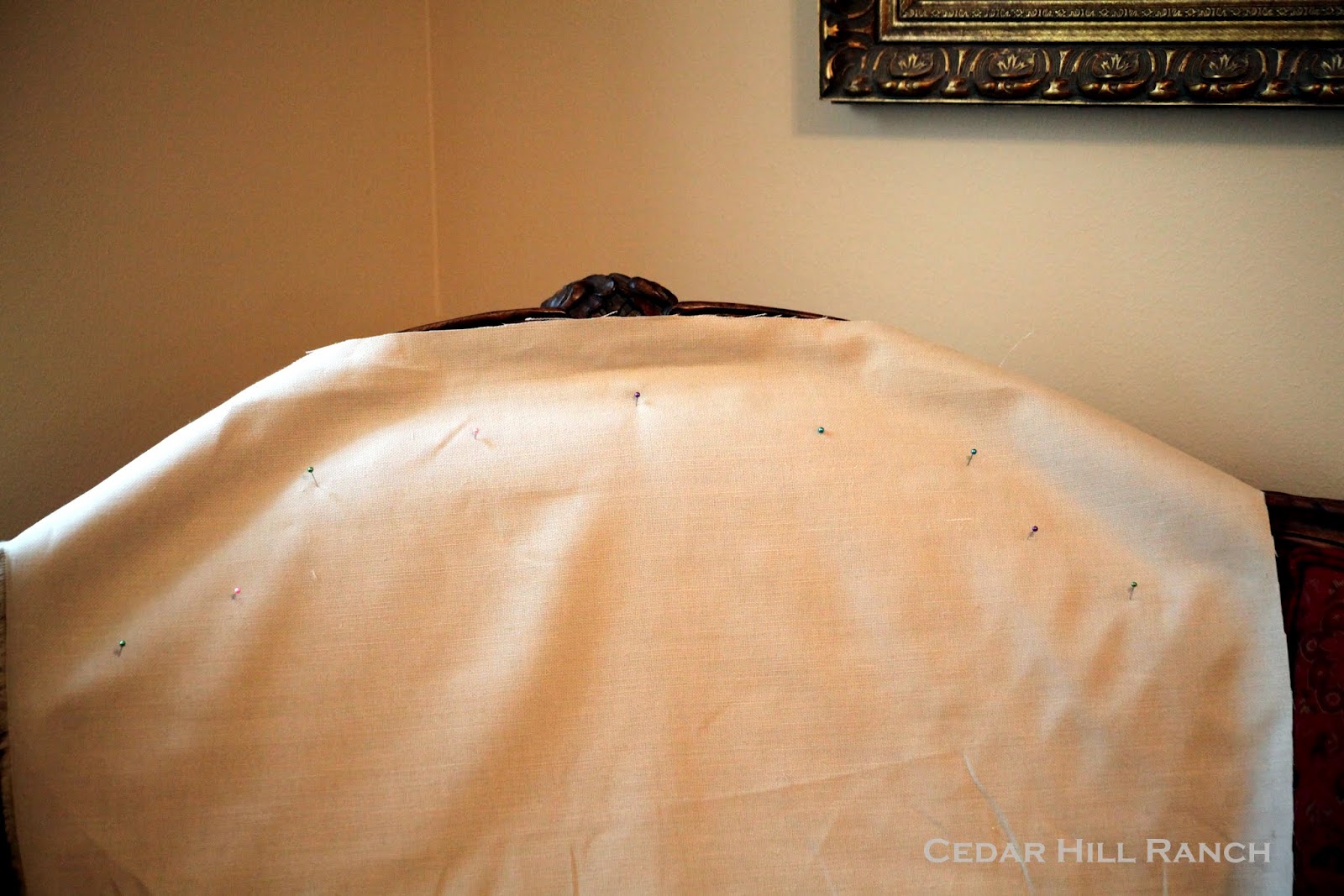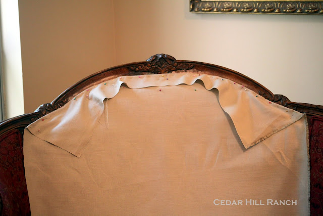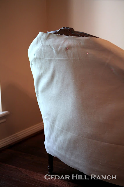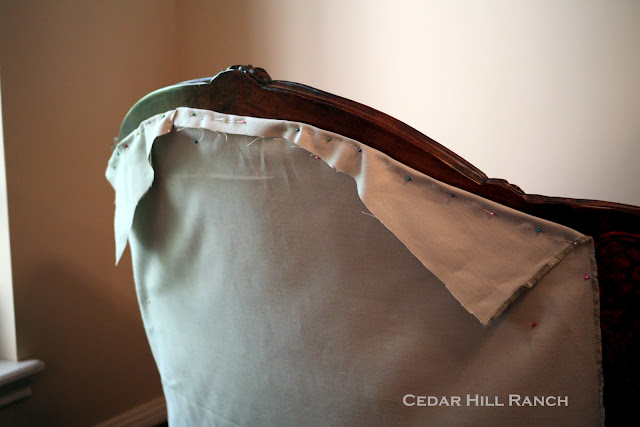 I like to do the main back piece next so the slipcover can begin to hold itself on my settee. Here you can see I have the fabric pinned on her back.