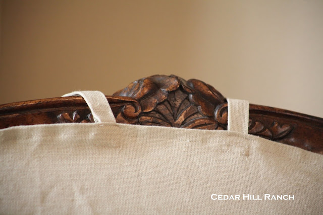Then I attached the straps back here. You can see the seams have been sewn so that they won’t fray. Don’t worry, I have the slipcover on inside out. You won’t see all of that when I’m finished.