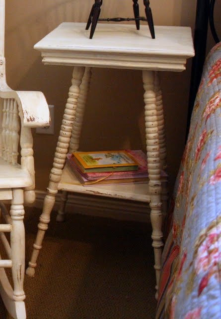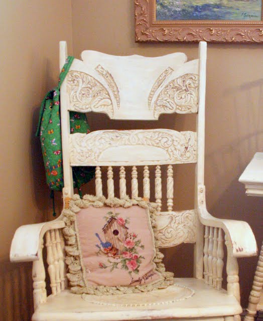 I think the rocker and the table look wonderful. Girl, I would LOVE to get rid of that “golden” oak. I would be thrilled if my hubby would agree to me painintg our kitchen cabinets and our fireplace. He just thinks you shouldn’t paint major things like that. I have tried to paint most of the furniture, though.