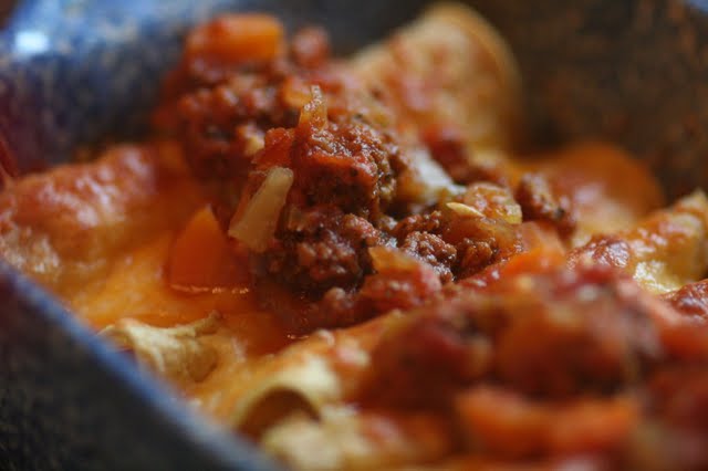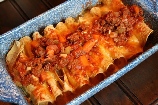 I made them recently and thought I would share them with you. The enchiladas are filled with cheese, and have a meat sauce on top.