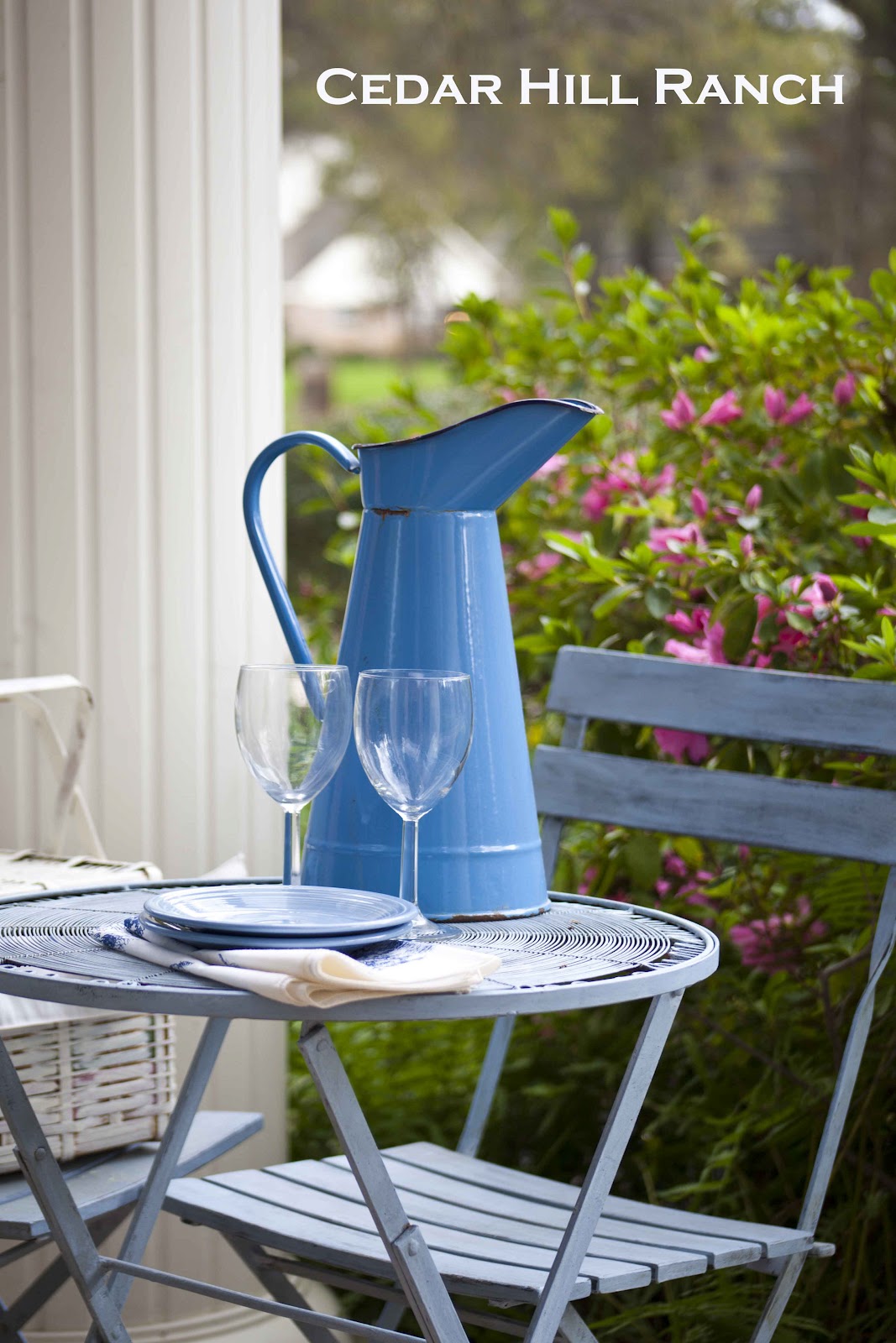 What a gorgeous setting, and that basket is perfect as a lunch hamper. and honey, that enameled pitcher is just glorious! Enjoy your beautiful days out there!!