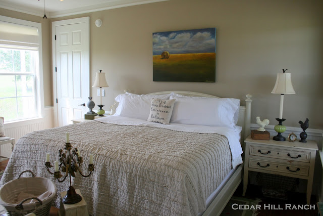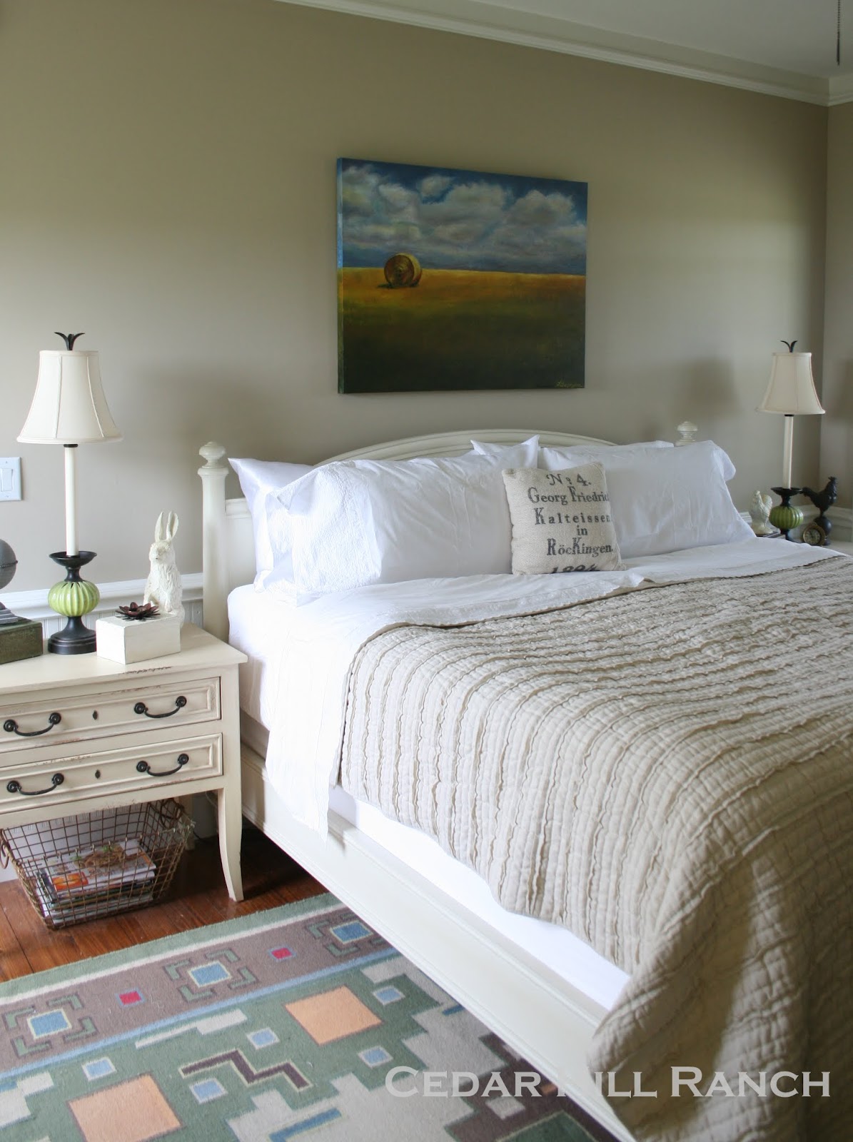 You might also notice that I removed my eyelet bed skirt, since it didn’t work with the new bed. I used a fitted white sheet to cover the foundation of our bed.   I was going to make a cover for the foundation, but Peggy talked me down off that ledge.  Why spend that much time sewing something that you can easily buy for not that much money?