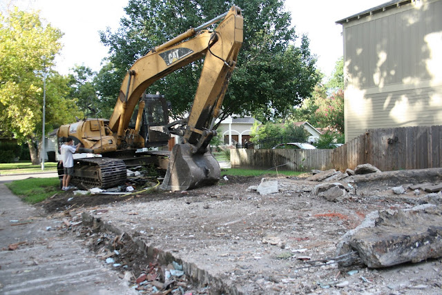 I kept asking the realtor about the keys, and finally she said she had mailed them to me. Meanwhile the builder said he was ready to tear down the old house. The keys were in the mail, and the wrecking crew was scheduled. Would I make it there in time? The answer came soon enough. The next day, on Saturday morning we got the keys. We decided to stop by the house to see what was going on. Here’s what we saw as we rounded the corner.