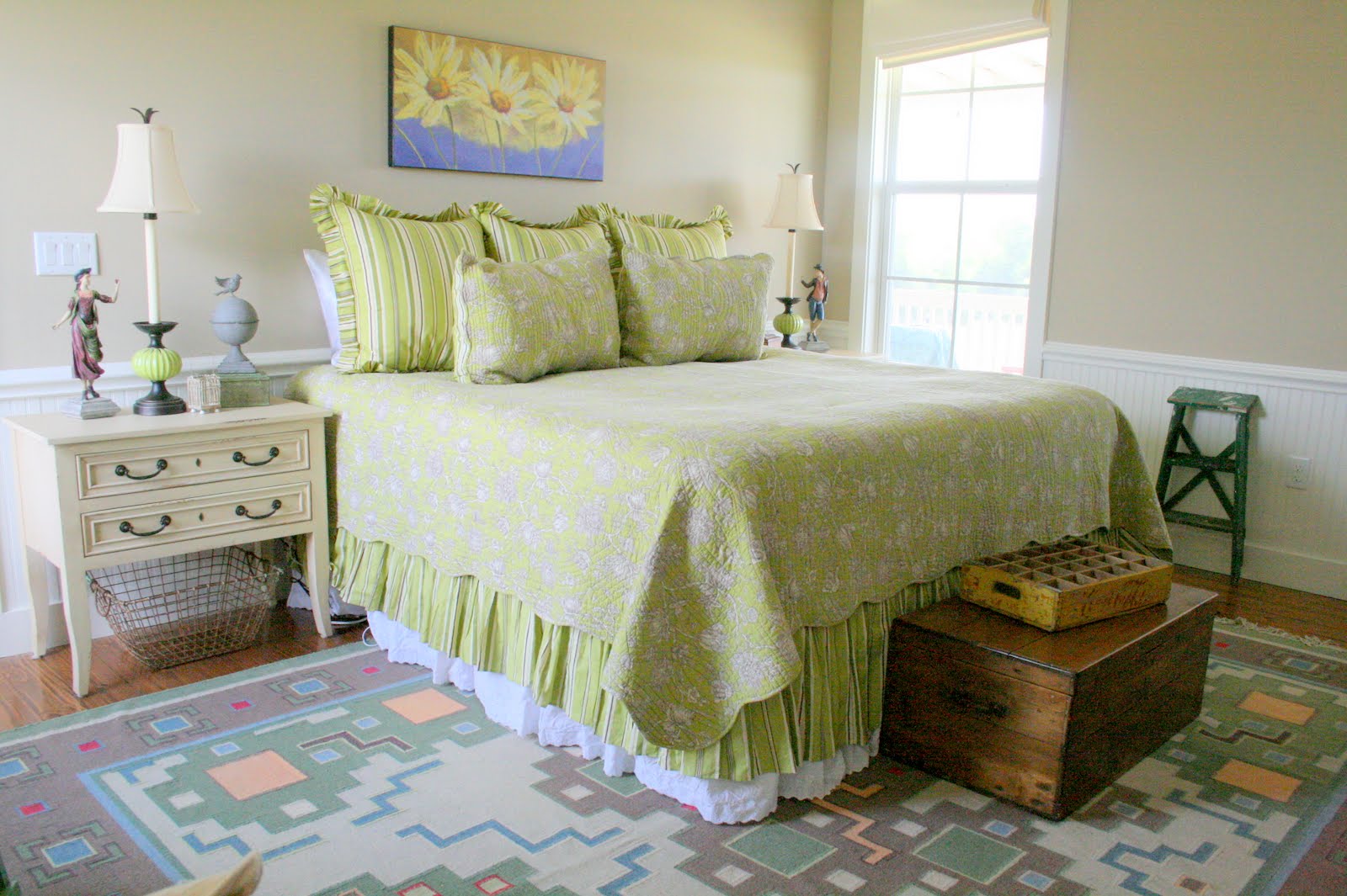 I prefer the white lamps to these here. Sometimes a contrast works best, and sometimes continuity works best. In this case I prefer the consistency of the white, maybe because I already have so much going on with the design on the chest. The best part is that I didn’t buy anything new to achieve my new look, I simply moved things around, and added a little bit of paint.