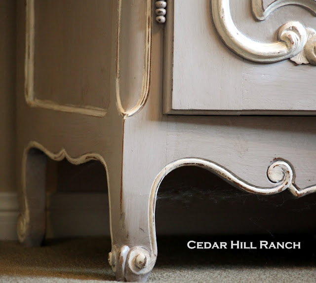 The lovely lady I bought it from, actually had already painted it this wonderful gray color, added the white accents, AND distressed it.