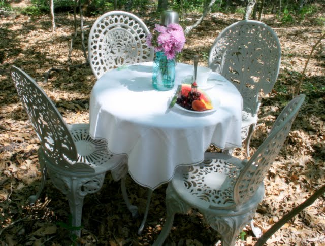 What a dreamy setting and you have it set up so beautifully! I do like the color you painted the table and chairs. We’ve been seeing and doing so many mason jars to try to look like the real vintage one from your mother. We’ve missed you and look forward to more of your great posts when things settle down at your house.
