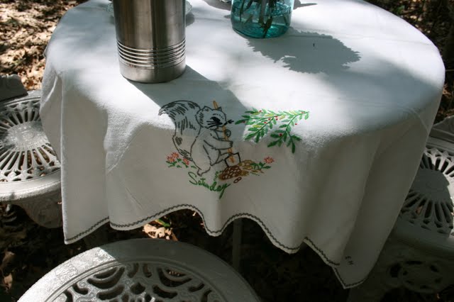 The tablecloth is a vintage tea towel, although it is so large that I used it for a tablecloth.
