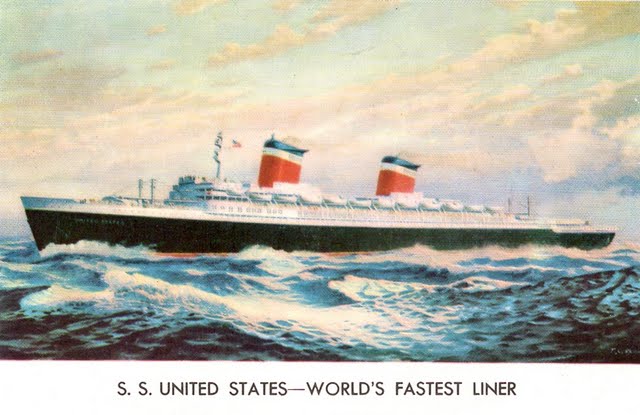 The year was 1959. my FIL was accepted for study at the chateau, and soon he and my MIL boarded a transaltantic ship for their first overseas trip. Here is a postcard they kept that pictures their ship, the SS United States.